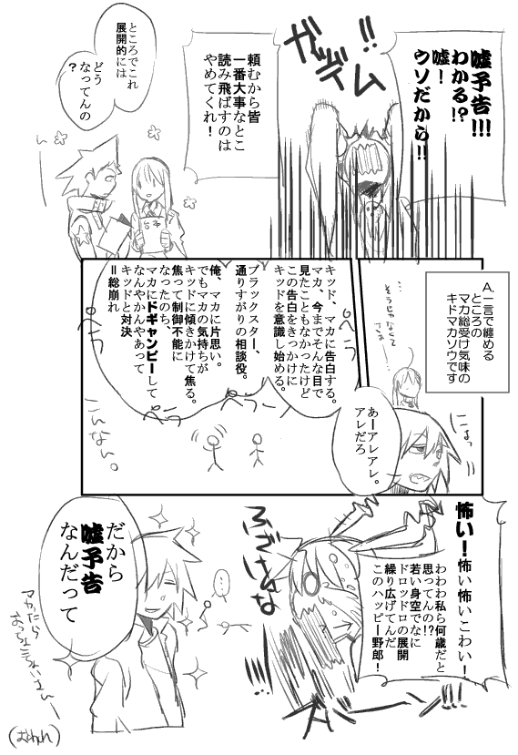 *** ソウルの嘘くさい微笑みは 「オレがマカにそんな事する訳ないじゃーん☆ぷっぷー☆」 の笑み うそくせえええええええええええええええええ *** 追記。 本編とか、ないよ~~~! ブラ ↓ って言いたかっただけで キド→マカ←ソウ は超アリアリ。